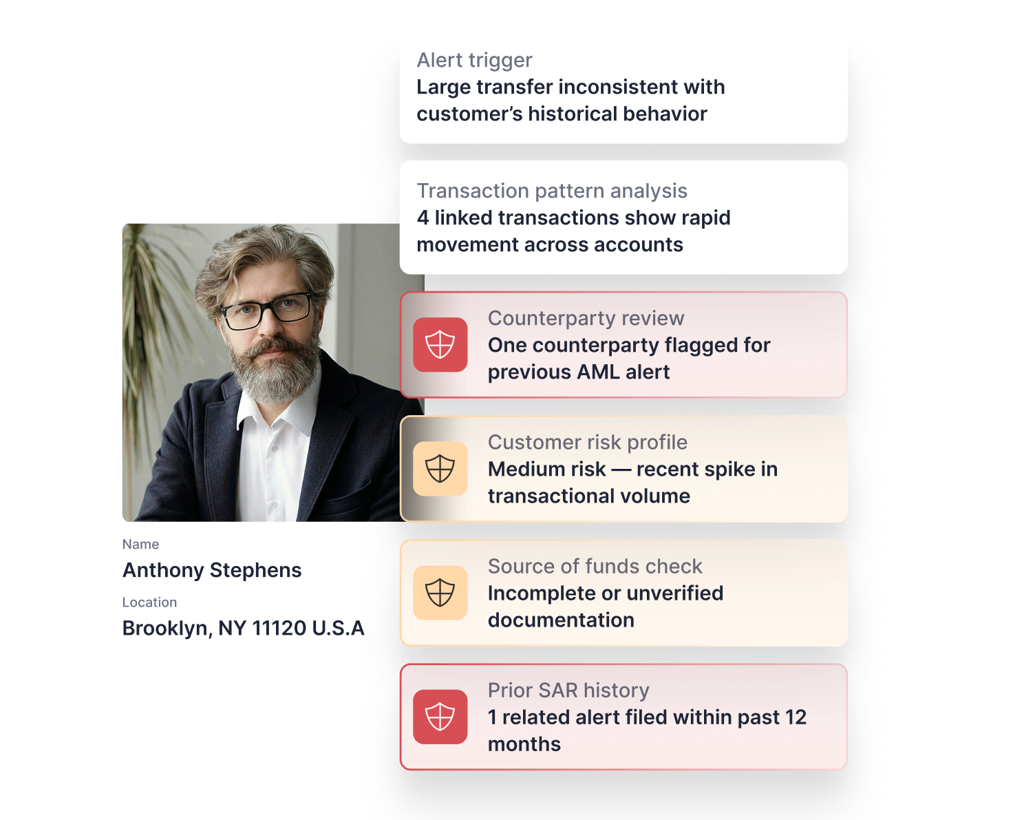 Deploy our L0 case review agent to analyze transaction patterns and identify truly suspicious behavior, reducing alerts that reach analysts.