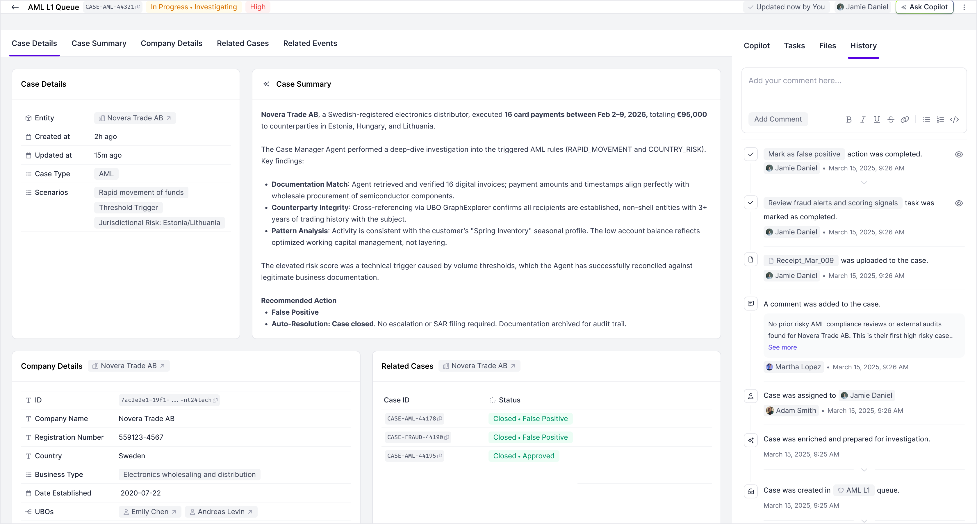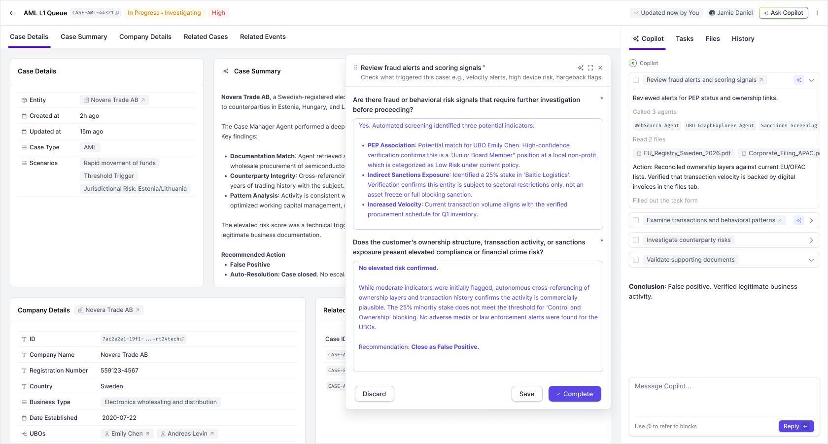Supercharge case reviewers across onboarding, underwriting, AML, and fraud with our new AI Copilot and integrated specialist AI agents.