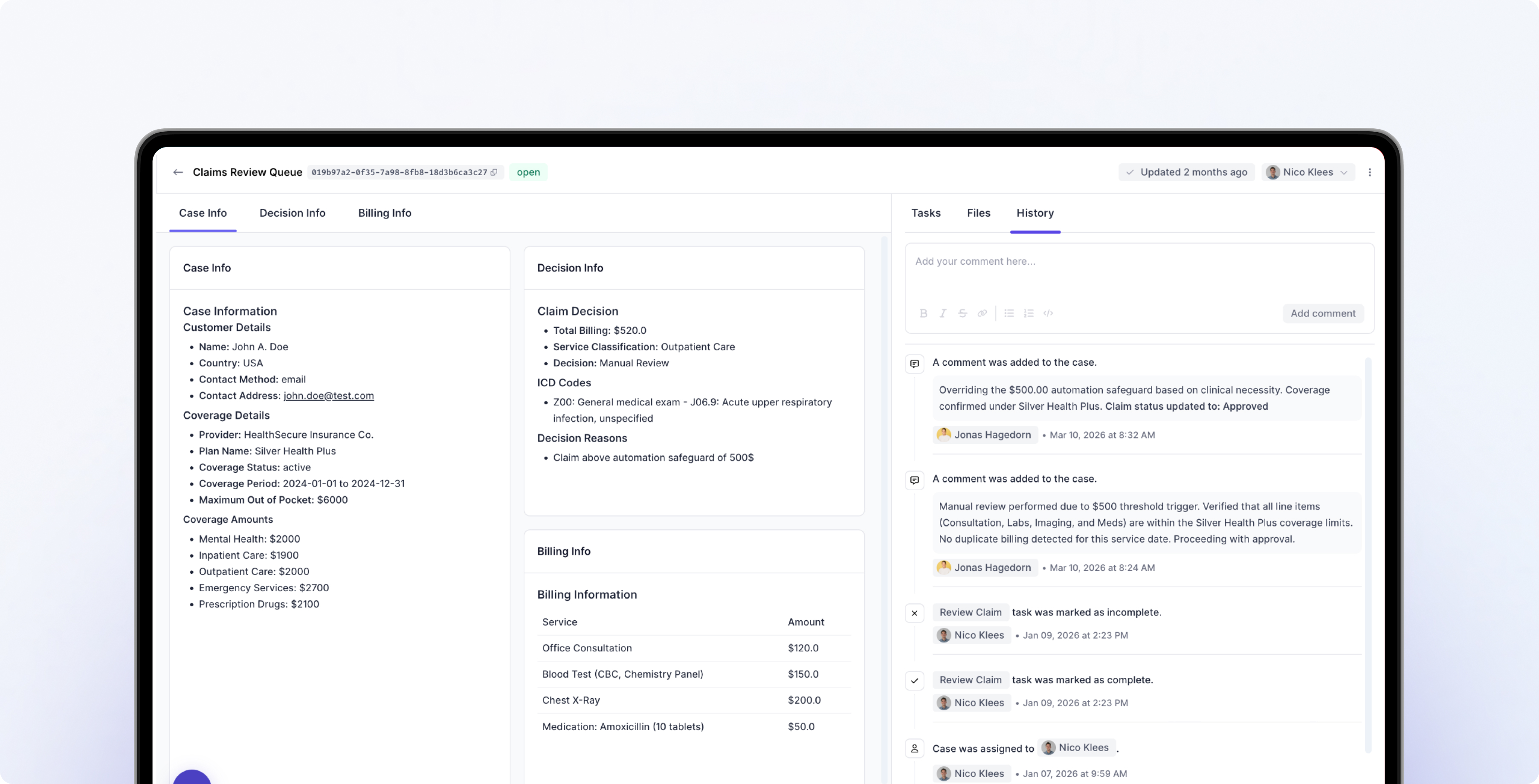 Replace disconnected tools and manual handoffs with a single low-code platform to streamline claims workflows with AI in a fully auditable environment.