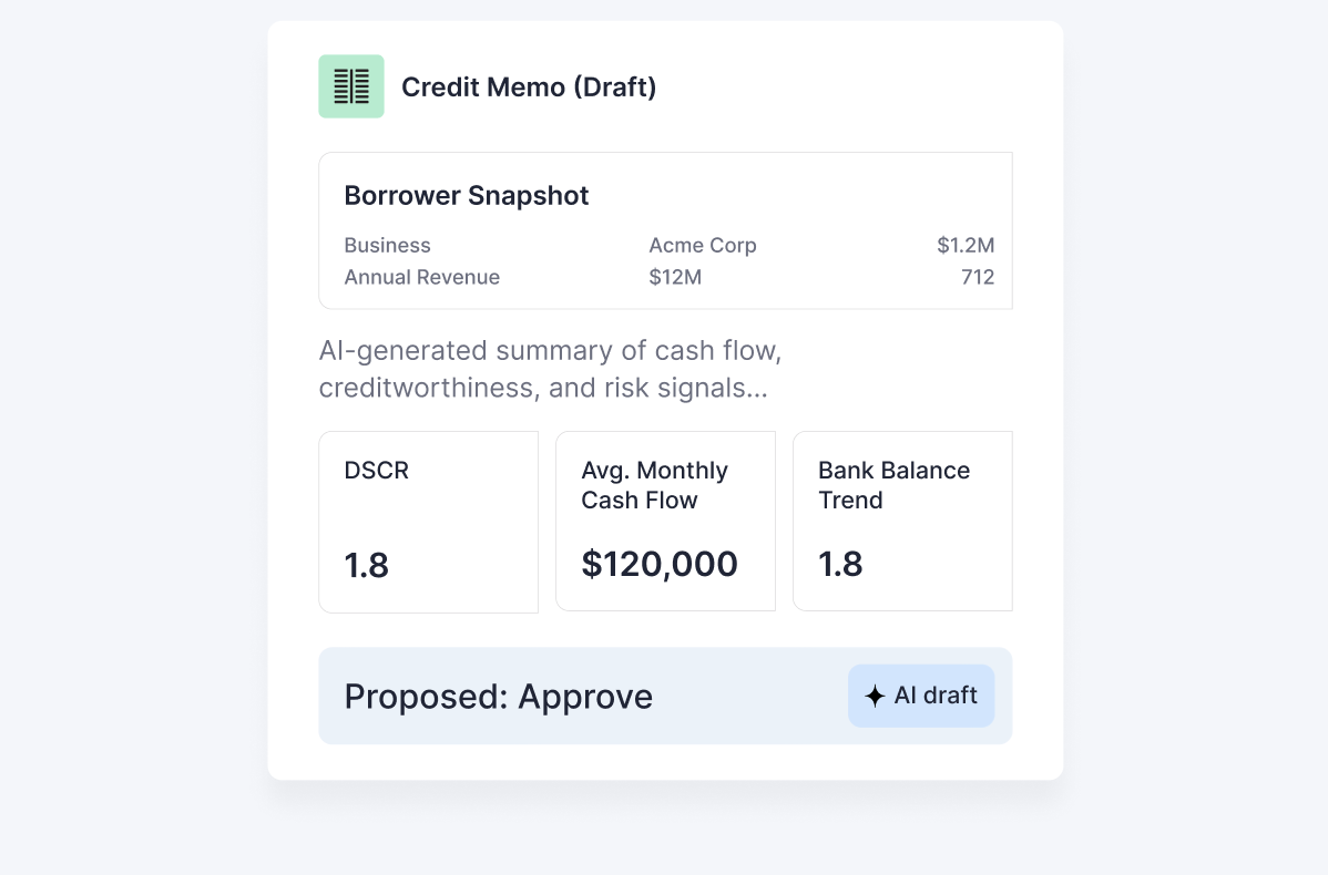 Auto-generate standardized, compliance-ready credit memos and reduce the manual effort that slows analysts down.