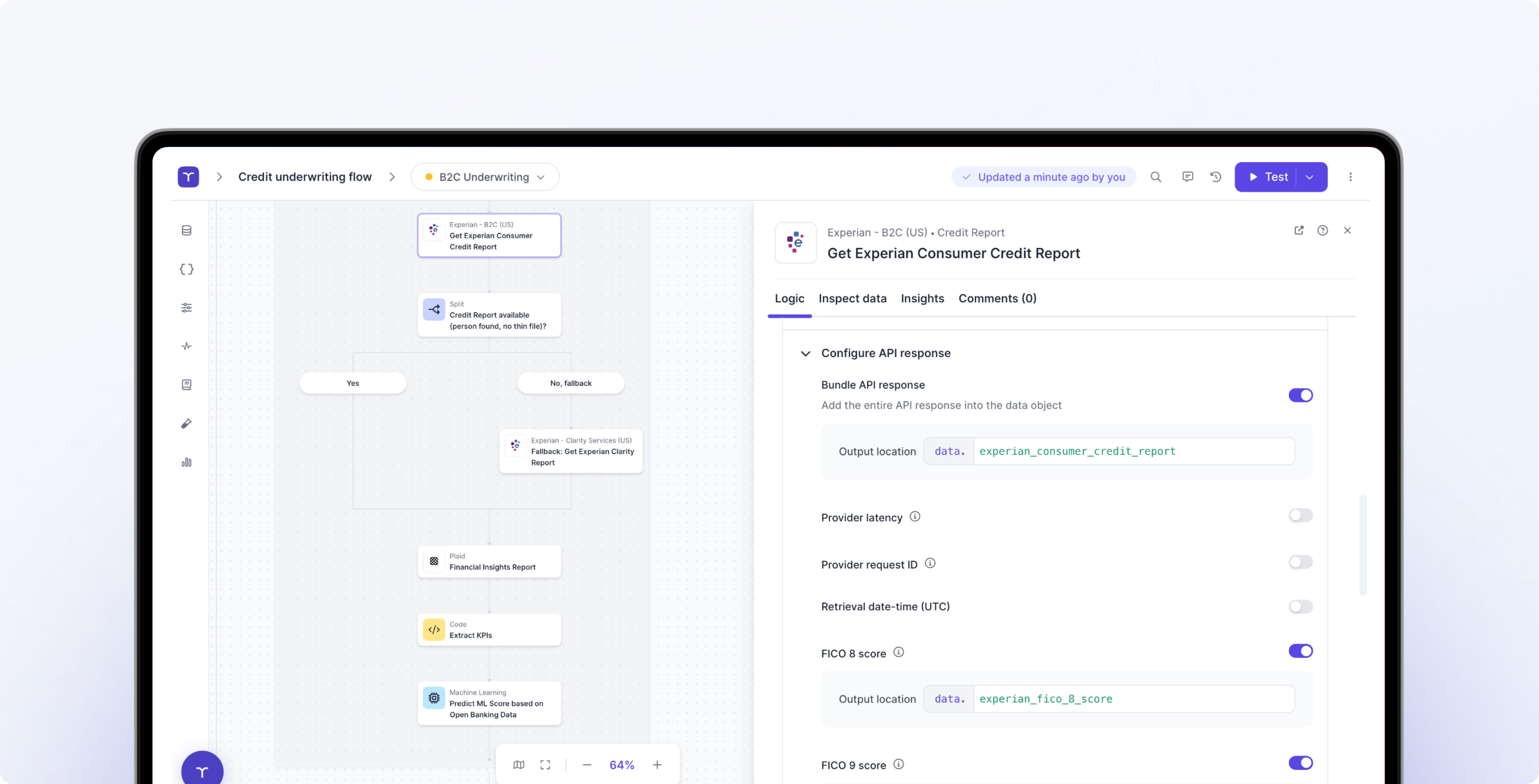 Build and test end-to-end credit decision strategies in a single platform.
