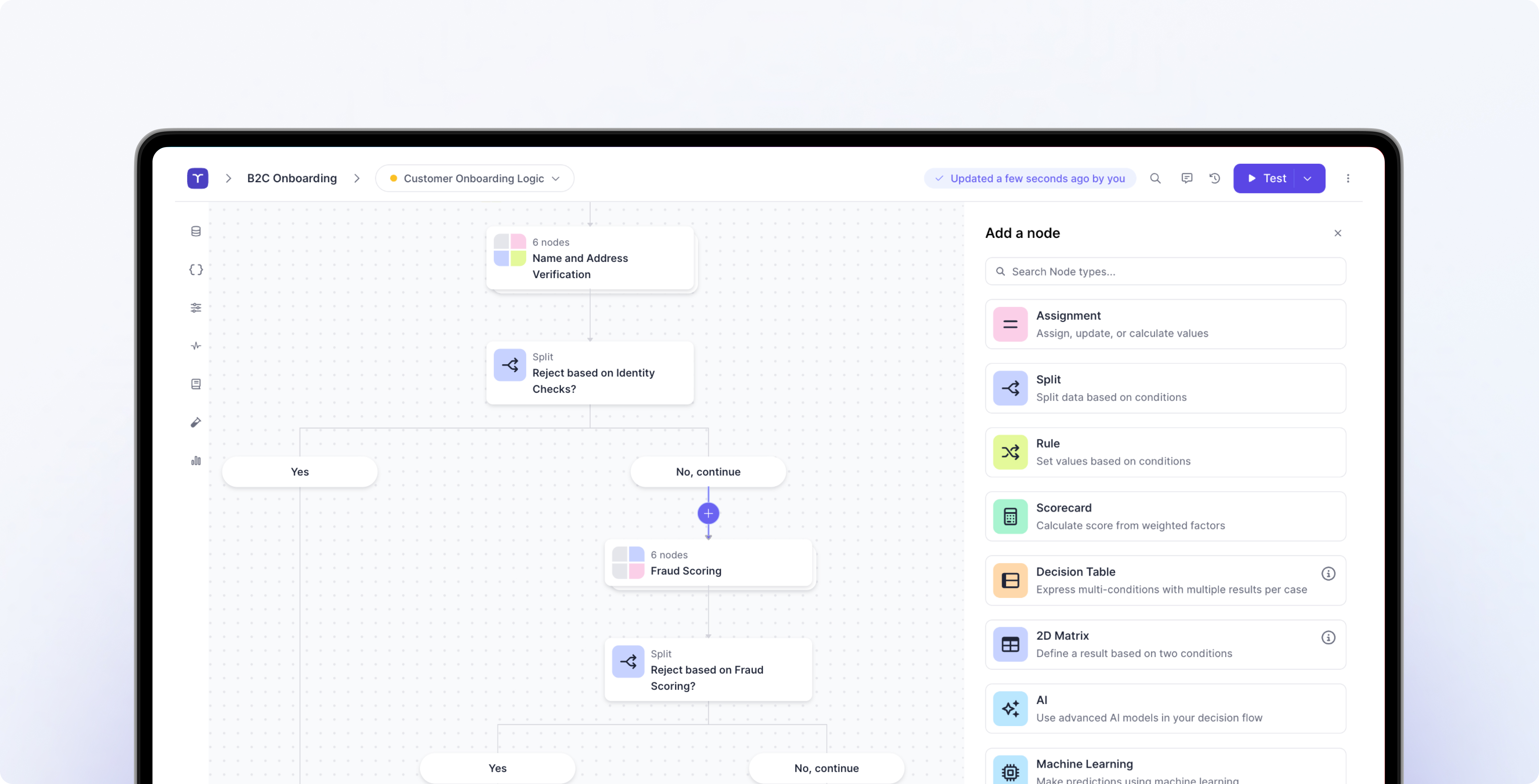 Build decision logic visually using pre-built 'nodes' that empower you to move fast without writing code.